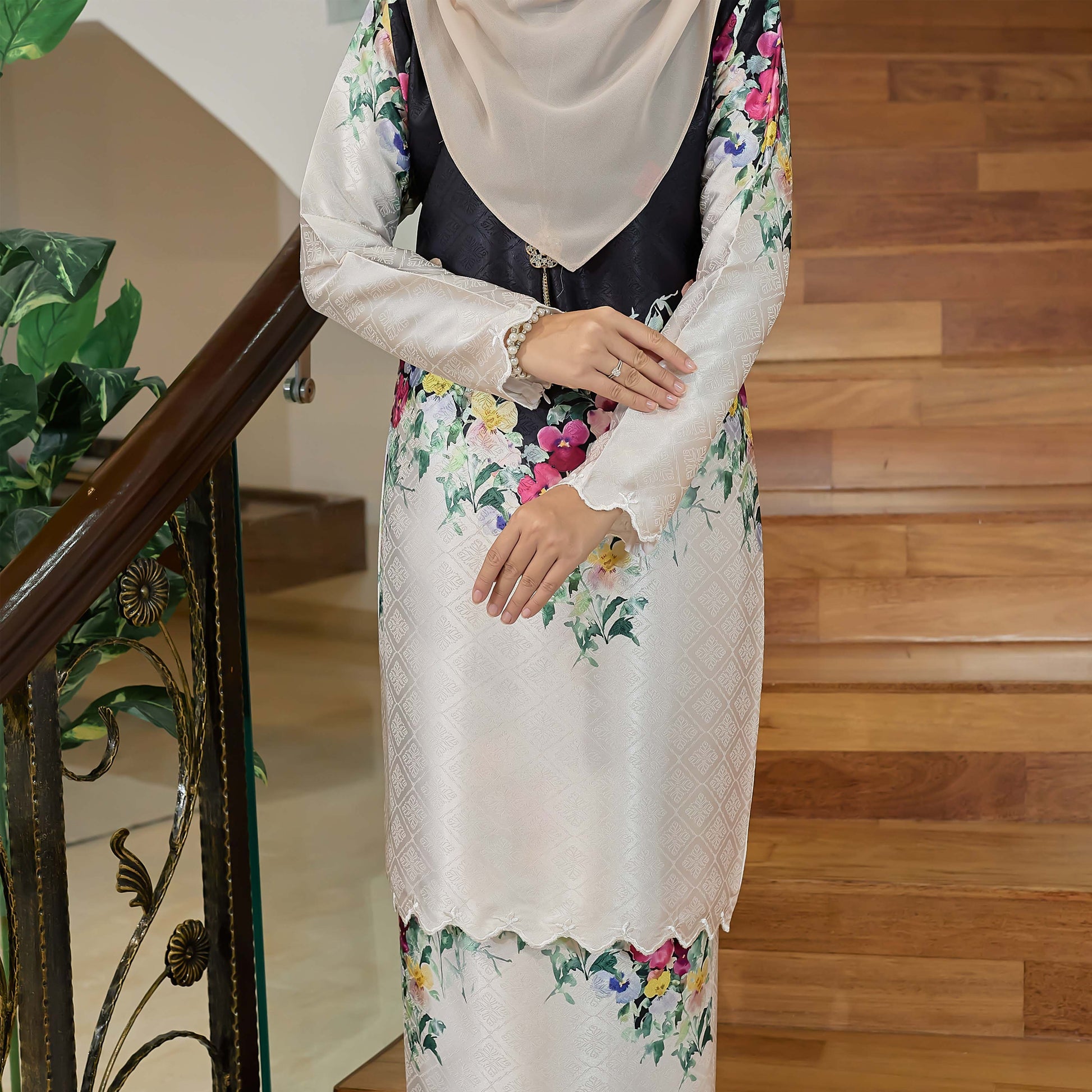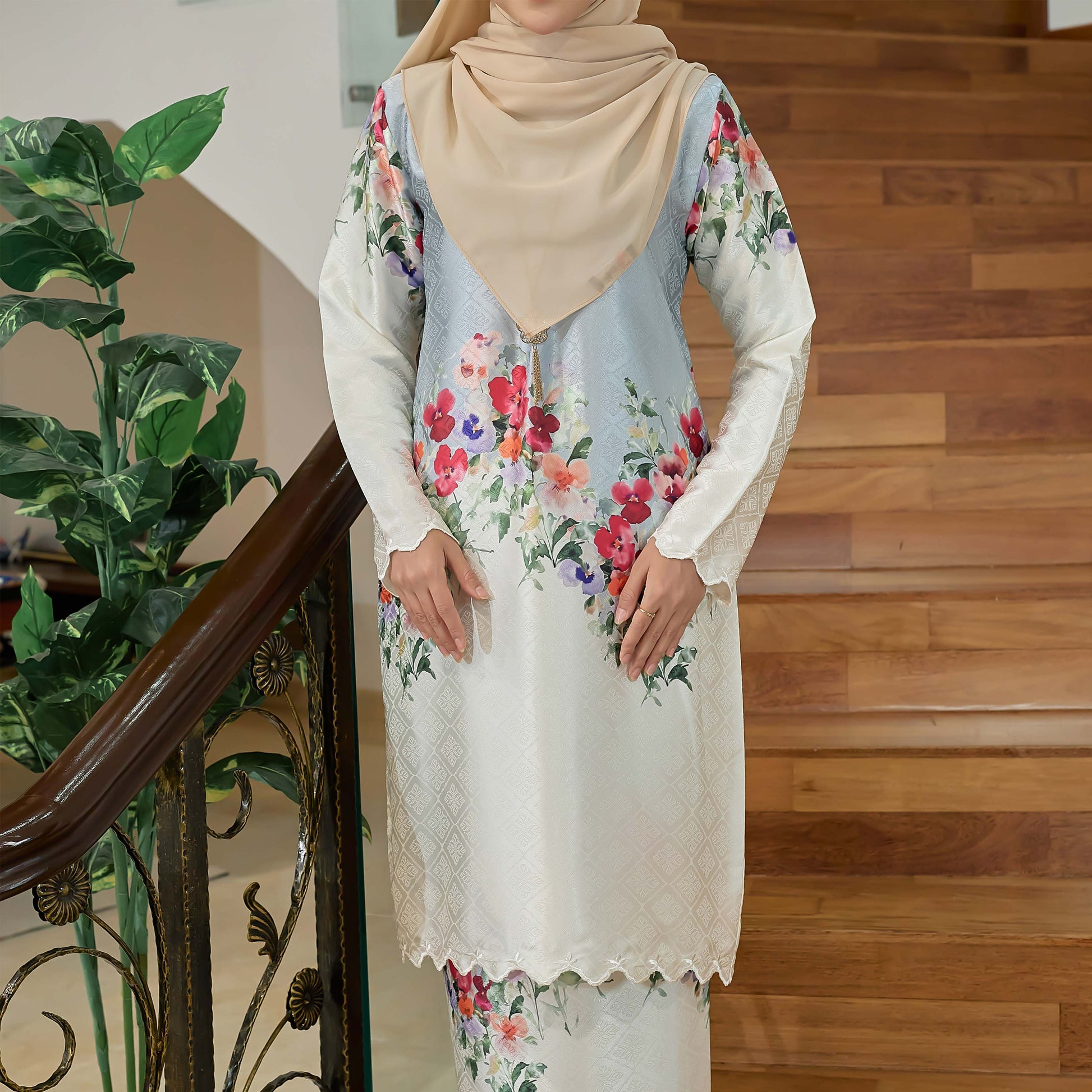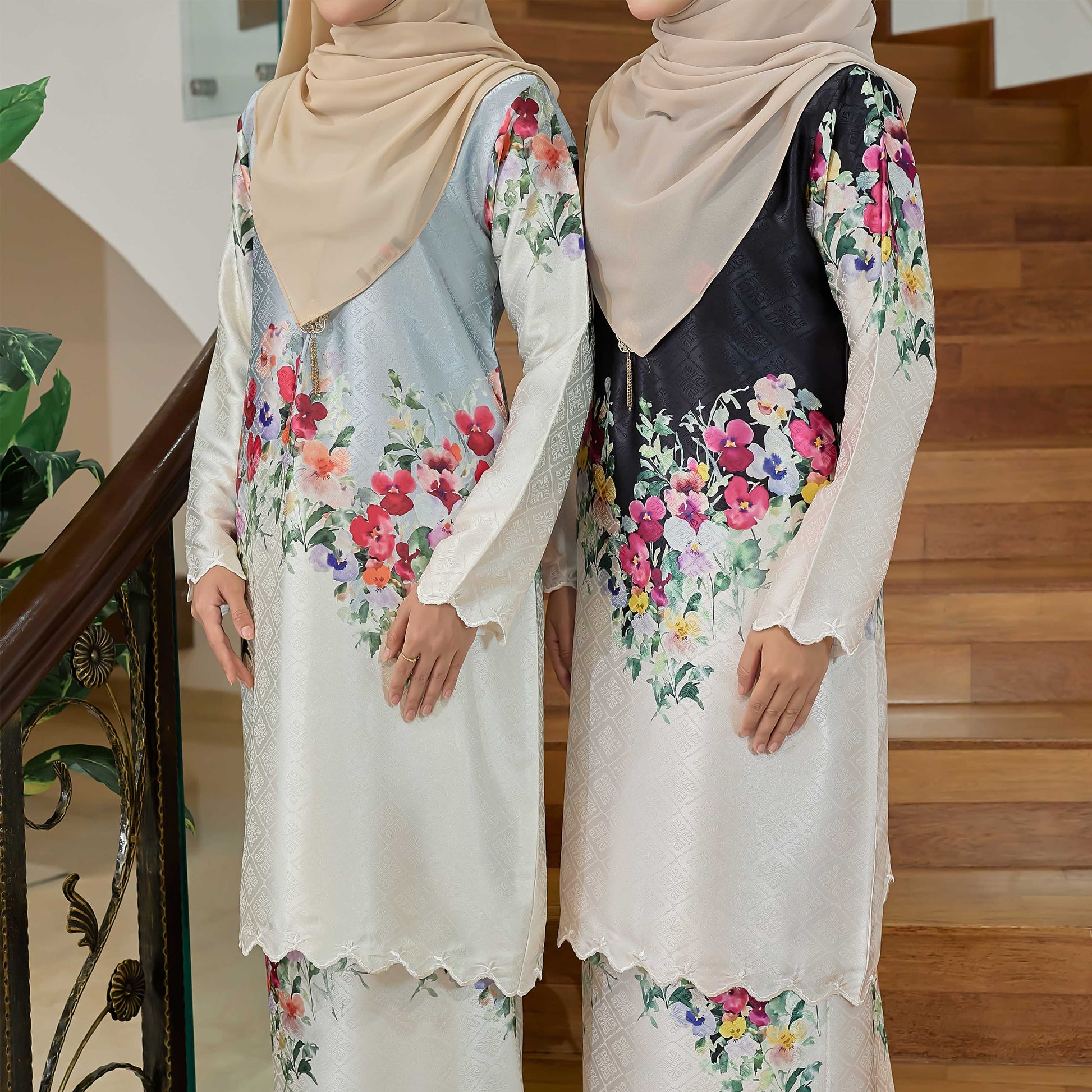 Jacquard kurung with striking floral pattern. Features Susun Belakang skirt, nursing-friendly chest zip, and wudhu-friendly wrist zips. Demands attention with its shimmery details and fearless style.