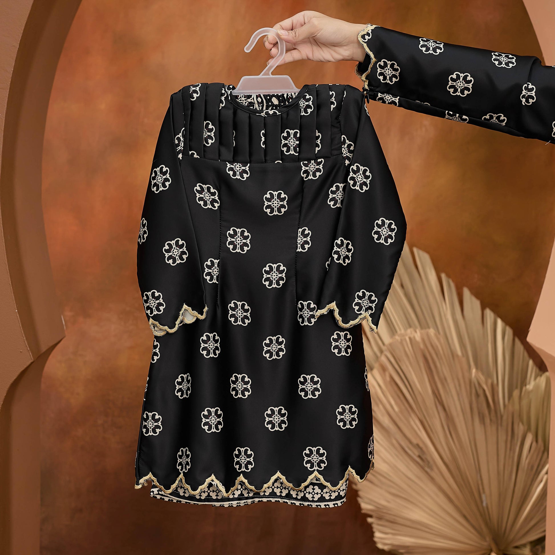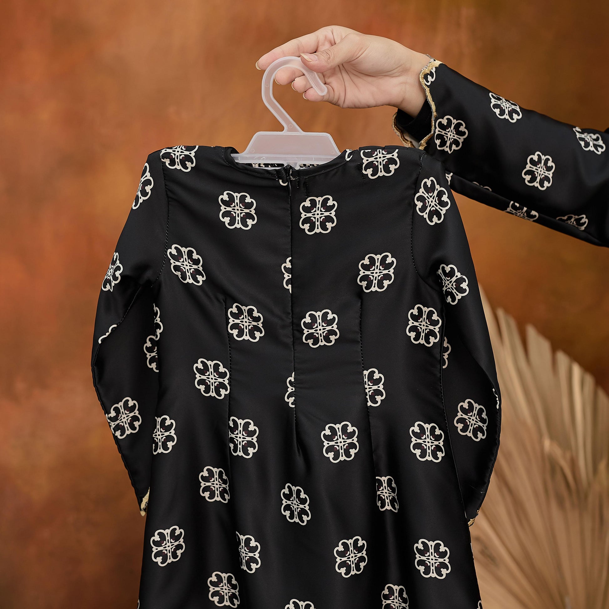 Premium Dubai Silk kurung with printed pattern, chest pleating, and embroidery. Features convenient back zip closure for easy dressing.